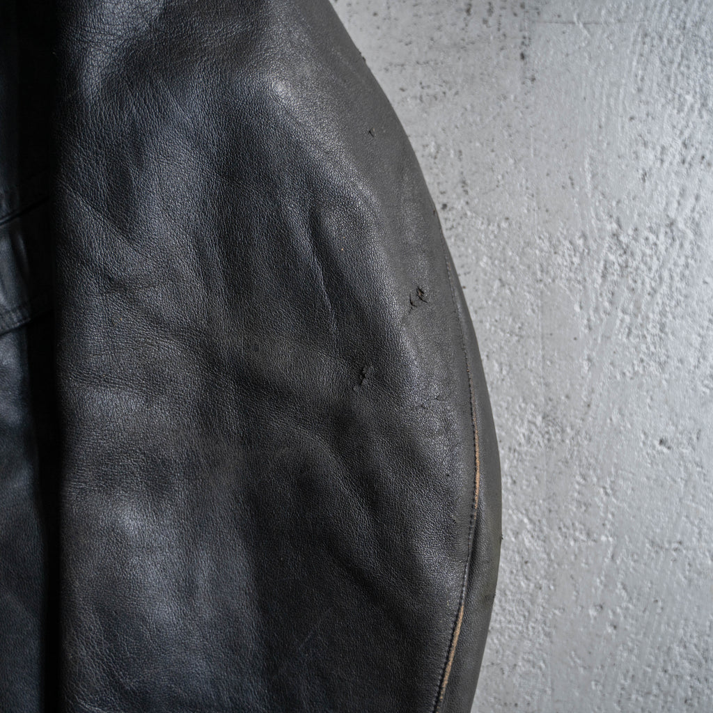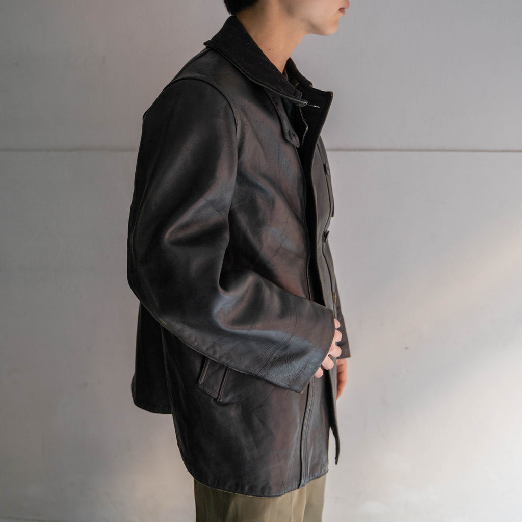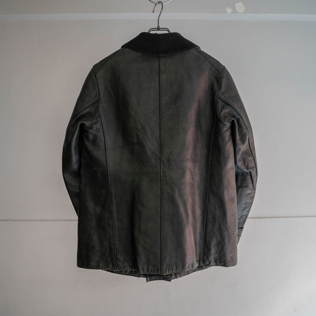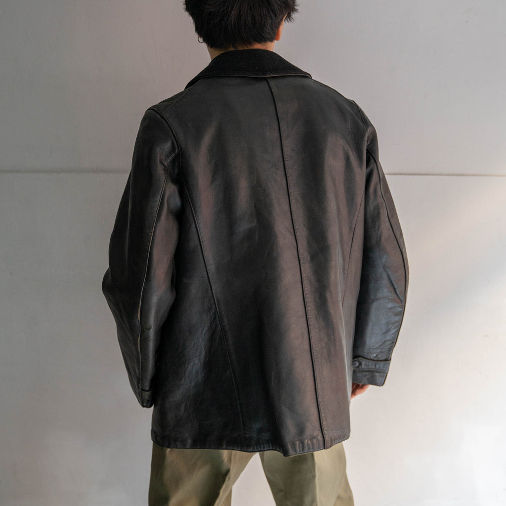 1940s France black corbusier leather jacket -black wool collar-