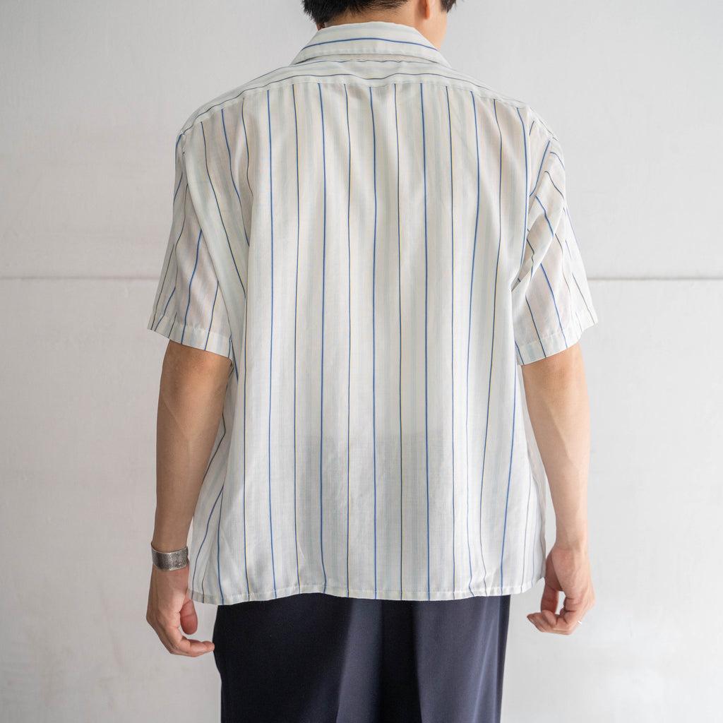 ホワイトベースにブルーの細いストライプが入る半袖シャツ。