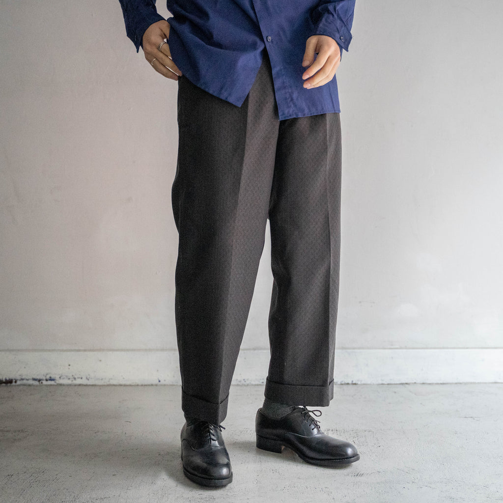 グレーベースにうっすら赤と黒のストライプのような模様が入るスラックス。
