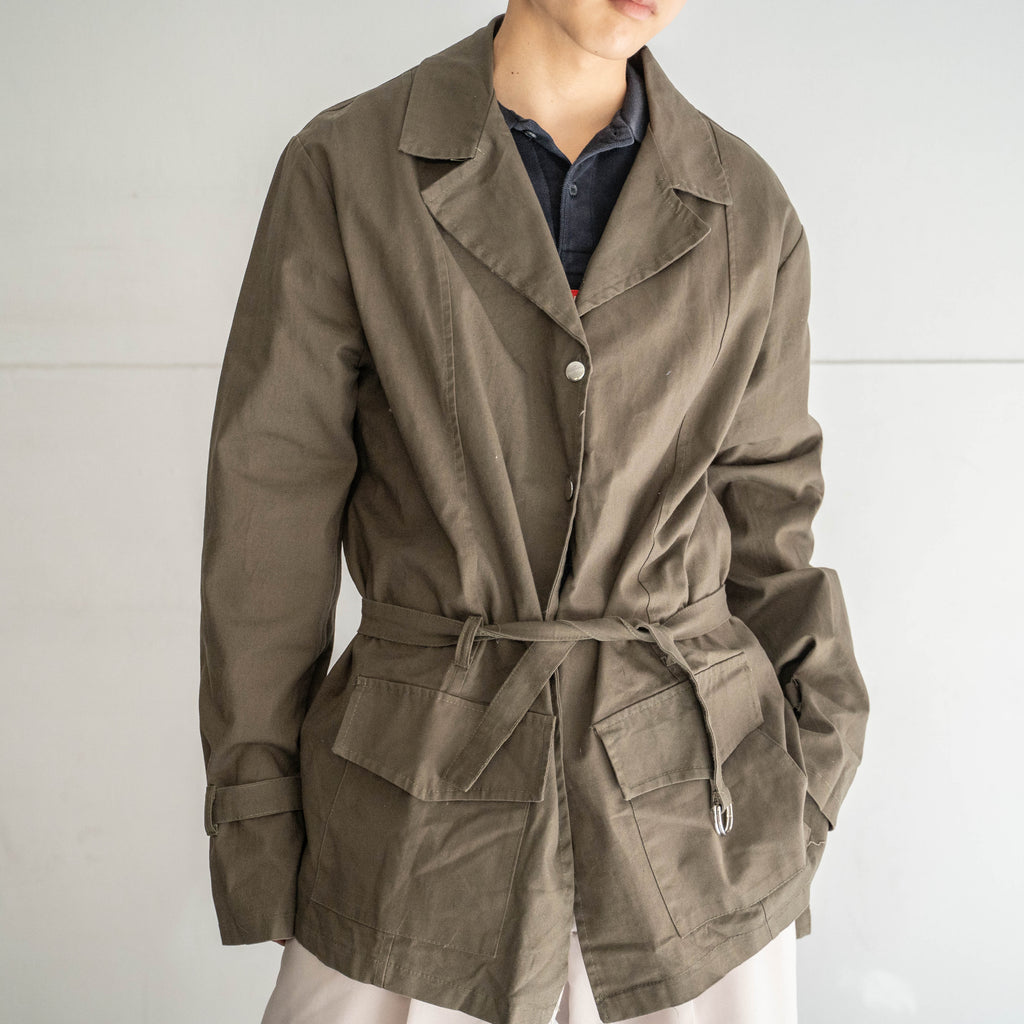 ブラウンカーキボディに打込みのボタンと袖/ウエストのベルテッドデザイン。