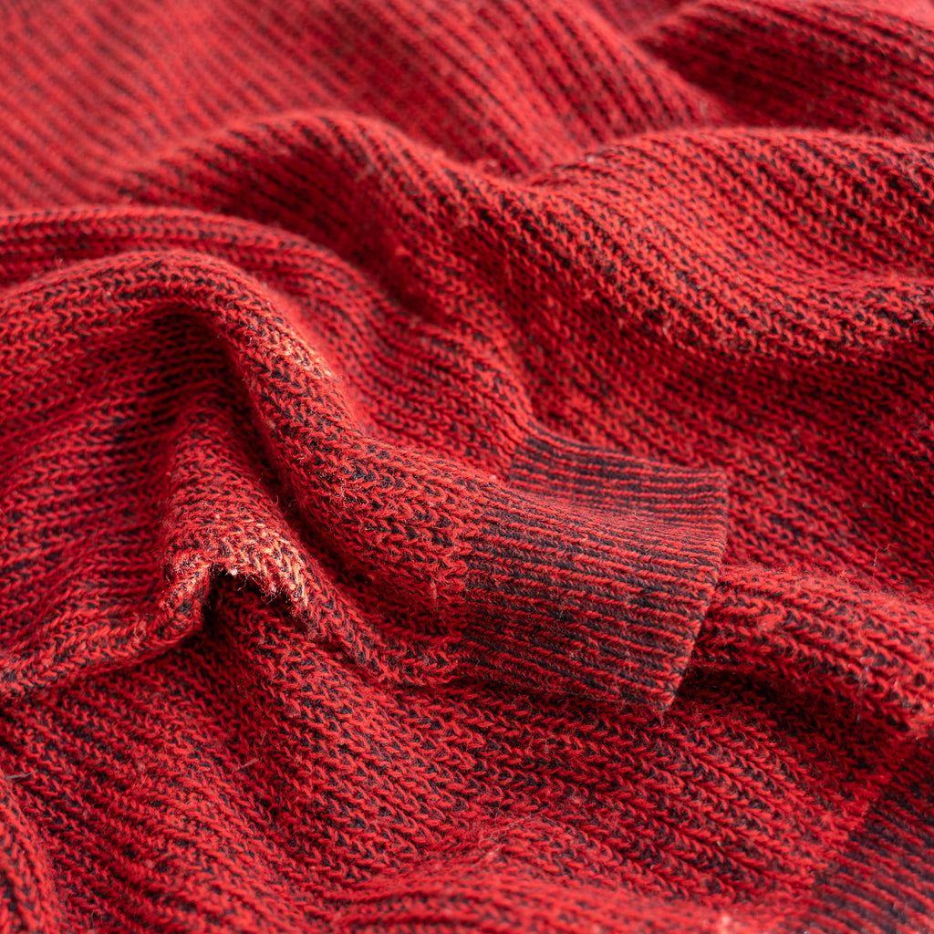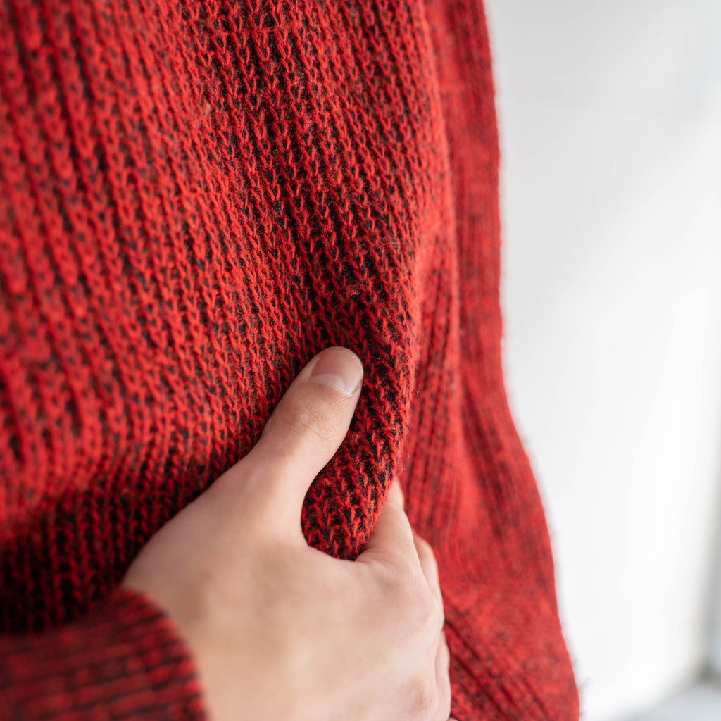 レッドにブラックの糸が混じり合った奥行きあるニット。