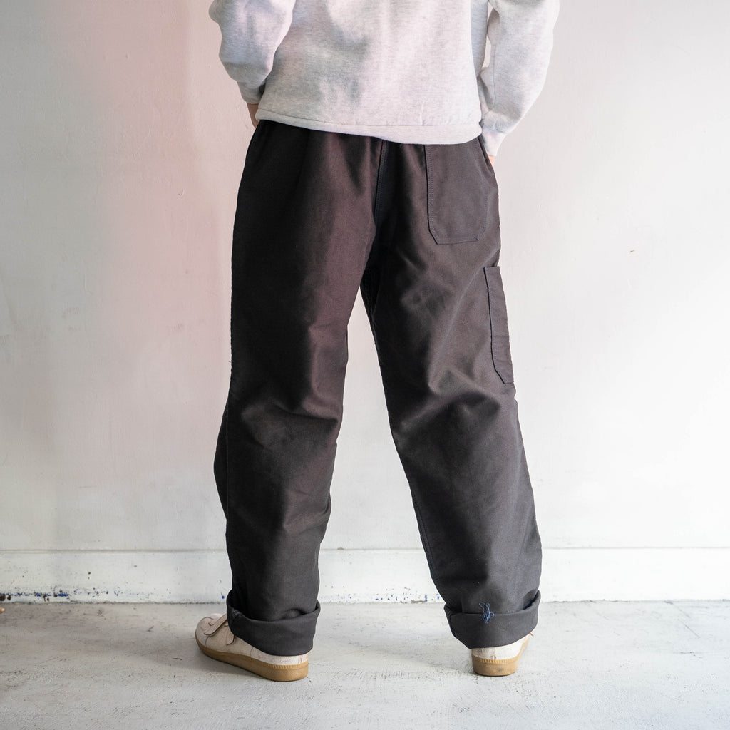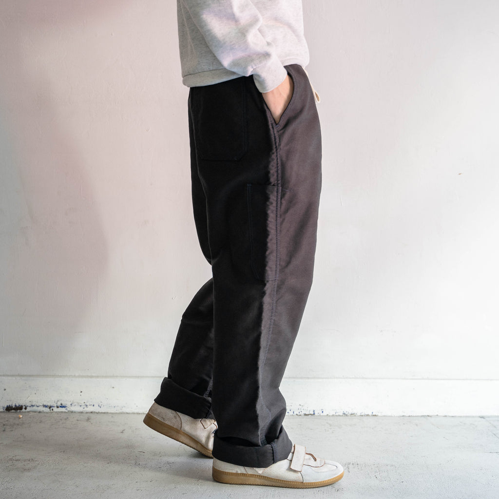 デッドストックのブルーモールスキンパンツを贅沢にも黒染め。