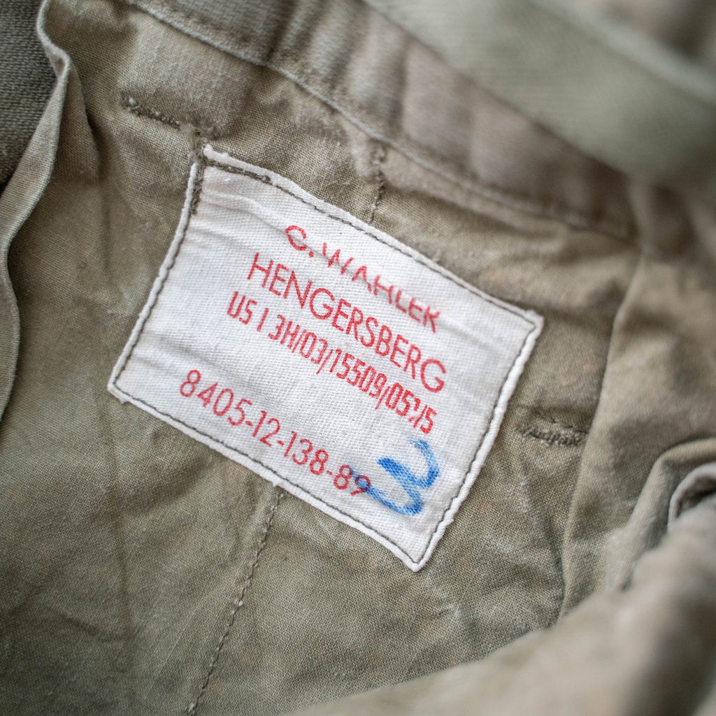 軍モノらしい肉厚なコットンに全体的にフェードがかったようなダークオリーブカラー。